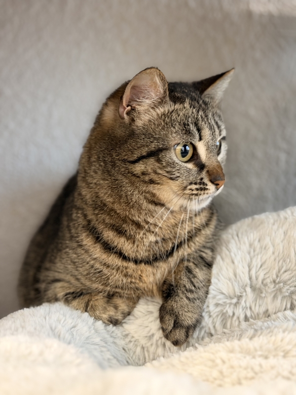 Leona on kasvult hästi pisike, kasukalt ilus pruun triibik ning suurte väljendusrikaste silmadega vaatab ta inimesele tõsiselt otsa.. Need silmad on esialgu veel veidi kartlikkust täis, kuid tasapisi on juba juhtunud see, et kiisu on hakanud inimesi usaldama. Juba oleme saanud talle pikemalt pai teha ja oi, kui pehme kasukas tal on!