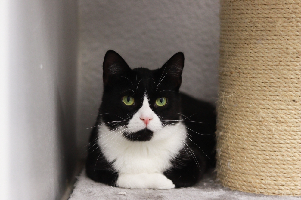 Kiisul on mustvalge lühike karvakasukas ja nunnu näoke.