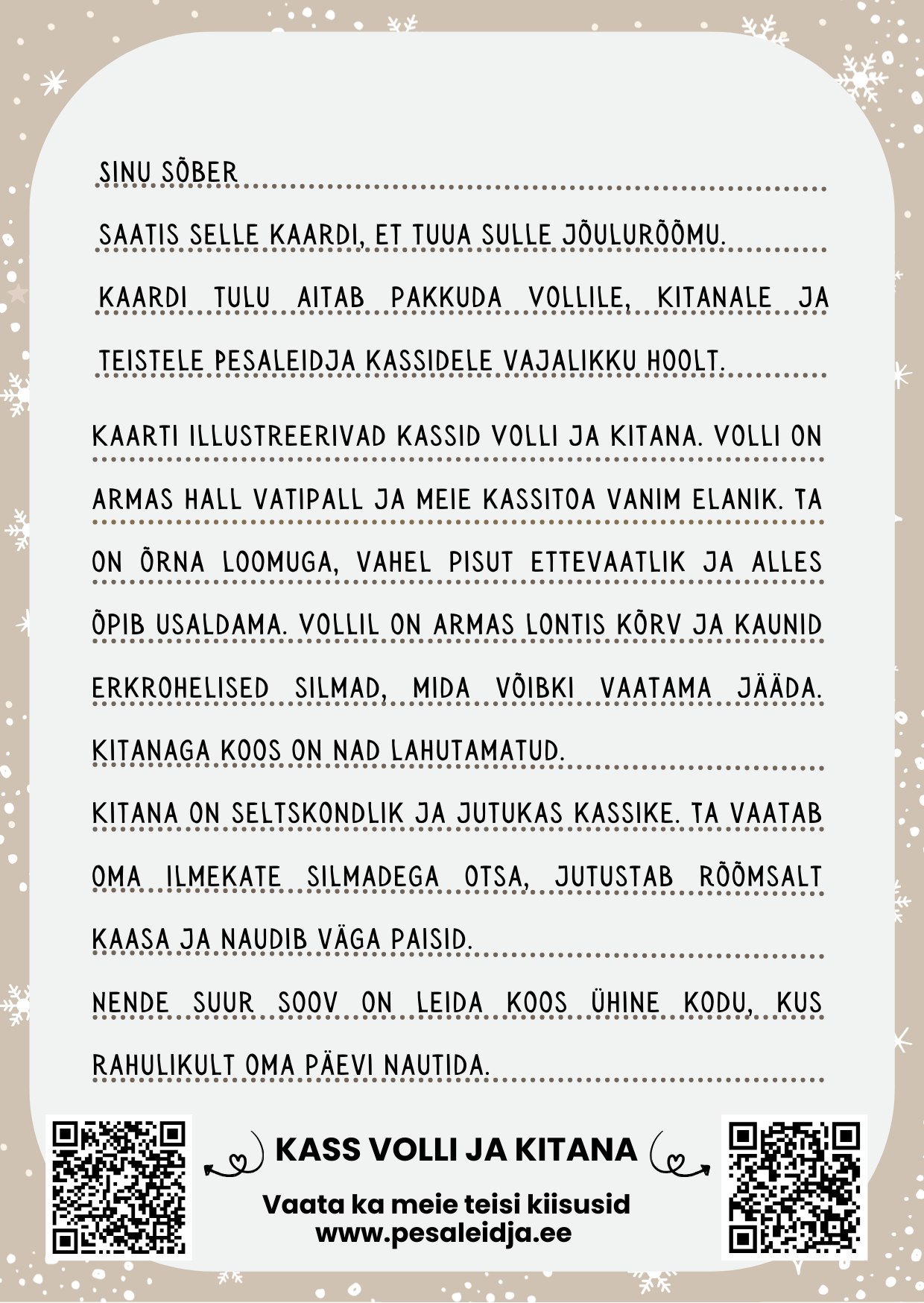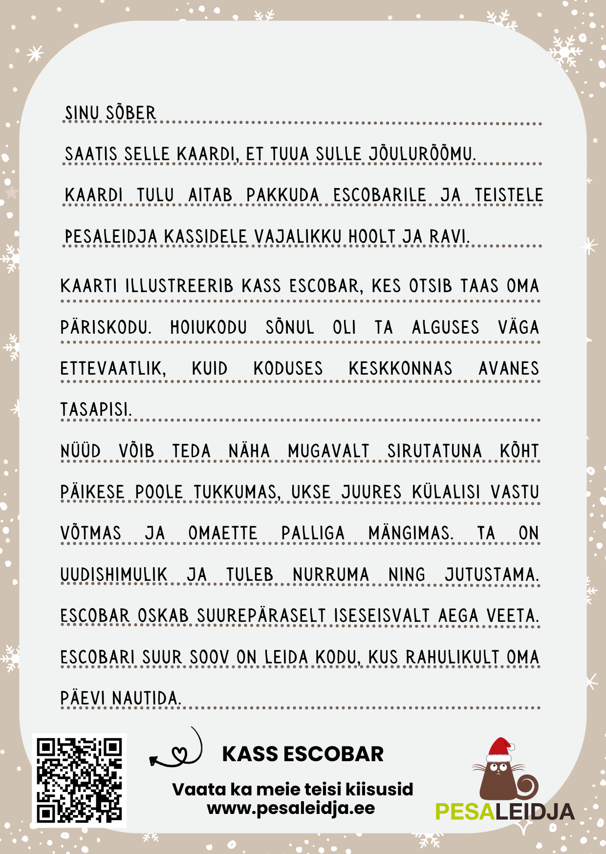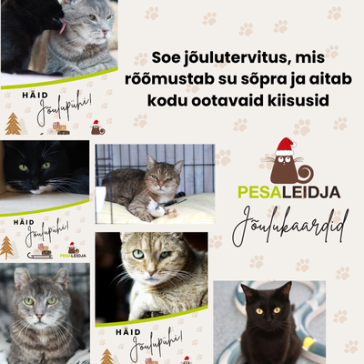 Pesaleidja jõulukaardid on loodud meie kõige erilisemate kasside piltidega. Nendega, kes on oodanud oma kodu kauem kui teised. Iga ostetud kaart aitab katta nende ja teiste Pesaleidja kiisude igapäevaseid kulusid nagu hooldus, toit ja ravi.