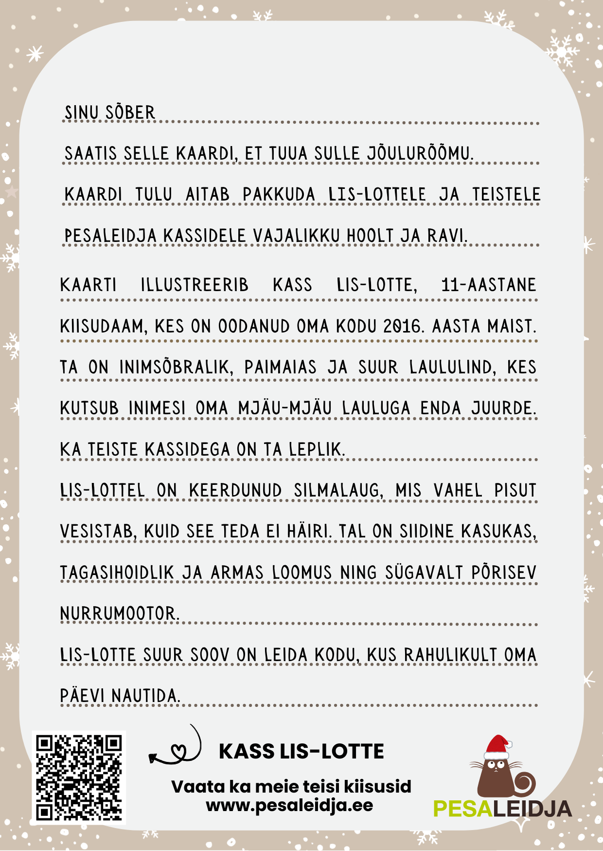 Kaarti illustreerib kass Lis-Lotte, 11-aastane kiisudaam, kes on oodanud kodu juba 2016. aastast. Ta on inimsõbralik, paimaias ja suur laululind. Tal on siidine kasukas, tagasihoidlik ja armas loomus ning sügavalt põrisev nurrumootor. Lis-Lotte soovib leida rahulikku kodu, kus nurrudes oma päevi veeta.